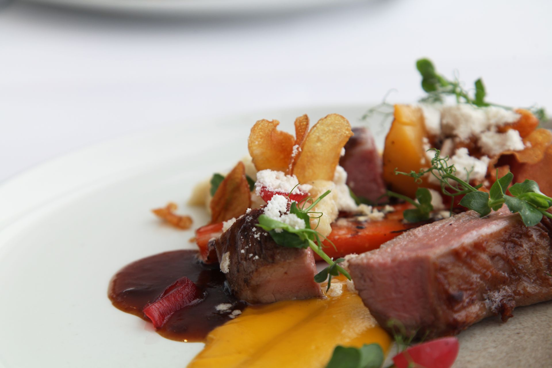 with crunchy potatoes, mixed vegetables and redwine glaze